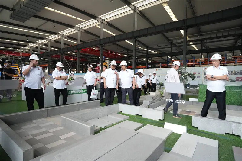 I utstillingsområdet for teglprøver vakte ulike permeable murstein, imiterte steinklosser og resirkulerte byggematerialer av fast avfall oppmerksomheten til den besøkende gruppen. Fu Binghuang, styreleder i Quangong Machinery Co.,Ltd, forklarte at gjennom teknologisk forskning og utvikling, Quangong Machinery Co.,Ltd. forvandler avfall som byggeavfall og avfall til miljøvennlige byggematerialer med høy verdi, og kaster over 10 millioner tonn fast avfall årlig. Styreleder Liu Guoquan inspiserte mursteinsprøvenes styrke og permeabilitet, og berømmet QGMs praksis med å "forvandle avfall til skatt" som en "modell for den sirkulære økonomien."