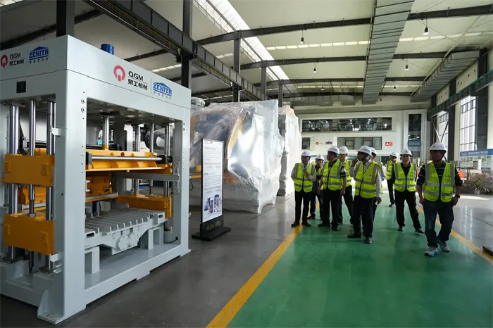 Etterpå beveget gjestene seg til utstillingsområdet for mursteinsprøver og så på ulike høykvalitets permeable murstein, fortausklosser, blokker og andre produkter produsert av QGM-utstyr, og uttrykte stor interesse for selskapets teknologiske prestasjoner "gjenvinning av fast avfall". I visningsområdet for mursteinfremstillingsutstyr inspiserte styreleder Lin Boqian og hans parti kjerneutstyret som den helautomatiske blokkformingsmaskinen og intelligent produksjonslinje uavhengig utviklet av QGM, og utvekslet tekniske fordeler og markedsapplikasjonsutsikter på stedet. Styreleder Lin Bo bekreftet fullt ut de enestående bidragene til QGM innen produksjon av avansert utstyr og grønne byggematerialer, og understreket: "QGM er en innovativ modell av private foretak i Quanzhou. Vi håper å kunne spille føderasjonens rolle som en bro i fremtiden, fremme den koordinerte utviklingen av industrikjeden" og hjelpe "Quanzhou Smart go global." Nestleder Fu Huabin svarte at selskapet vil fortsette å øke investeringene i forskning og utvikling og samarbeide med partnere fra alle samfunnslag for å utforske nye muligheter for integrert utvikling av intelligent utstyr og grønn produksjon.